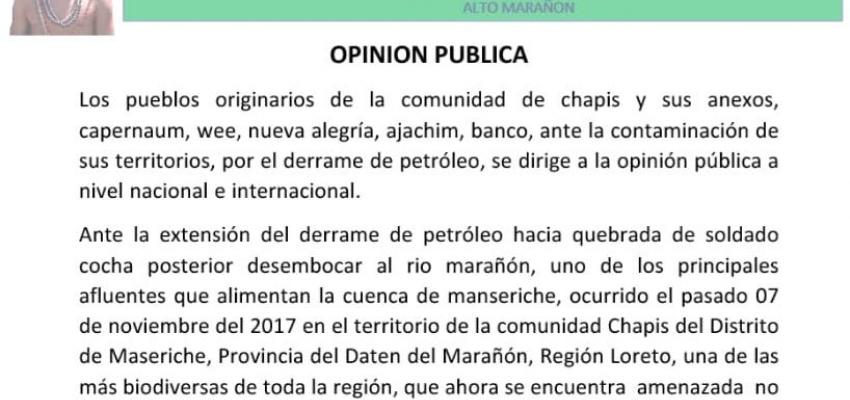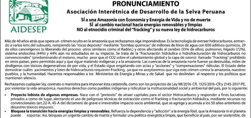 Organizaciones indígenas e instituciones de la sociedad civil se sumaron a Pronunciamiento de AIDESEP pidiendo prohibir el “Fracking” en la Amazonía y el rechazo a su nueva ley de hidrocarburos
