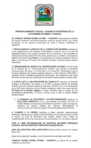 El Consejo Shipibo Konibo Xetebo exige la exclusión inmediata de las comunidades del ámbito del ACR Imiría y demanda el reconocimiento pleno de sus propias formas de gobernanza territorial y libre determinación. Asimismo, hace un llamado a la unidad de las organizaciones indígenas, federaciones y aliados nacionales e internacionales frente a lo que consideran una amenaza a su autonomía y a sus derechos colectivos.